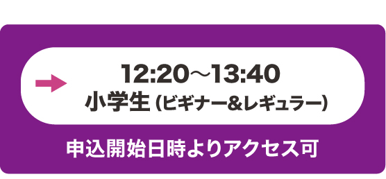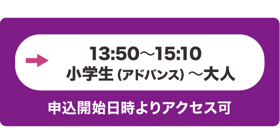 | 内容 | ①【 10:50〜12:10 】 5歳〜小学生(ビギナー) ②【 12:20〜13:40 】 小学生(ビギナー&レギュラー) ③【 13:50〜15:10 】 小学生(アドバンス)〜大人 |