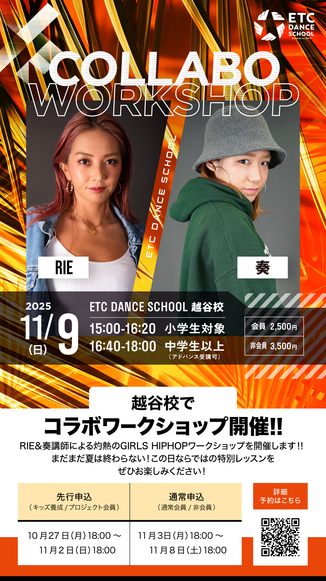 越谷校で11/9(日) 「RIE×奏」によるGIRLS HIPHOPコラボワークショップ開催!!