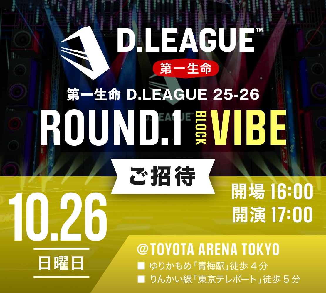 対象公演 | D.LEAGUE ROUND.1 BLOCK VIBE 2025年10月26日(日) OPEN 16:00 / START 17:00 |