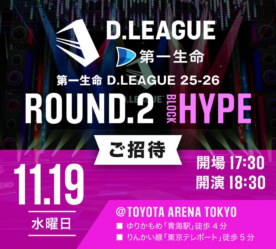 | 対象公演 | D.LEAGUE ROUND.2 BLOCK HYPE 2025年11月19日(水) OPEN 17:30 / START 18:30 |