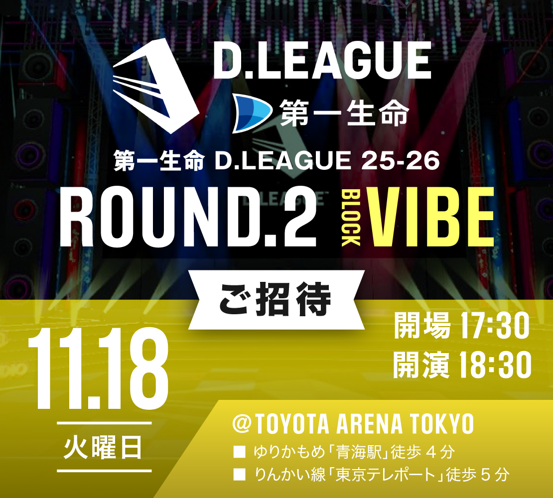 | 対象公演 | D.LEAGUE ROUND.2 BLOCK VIBE 2025年11月18日(火) OPEN 17:30 / START 18:30 |