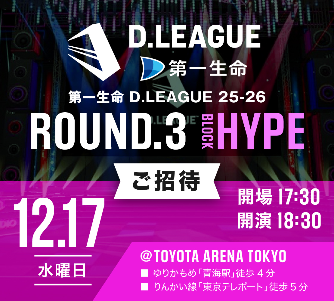 | 対象公演 | D.LEAGUE ROUND.3 BLOCK HYPE 2025年12月17日(水) OPEN 17:30 / START 18:30 |