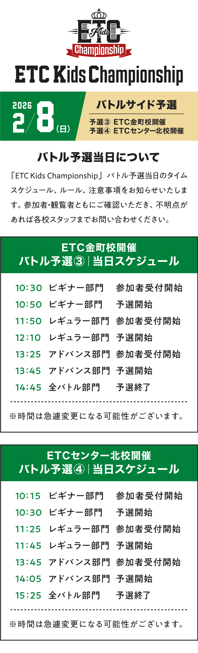ETCキッズチャンピオンシップ バトルサイド 2/8(日)予選当日のお知らせ