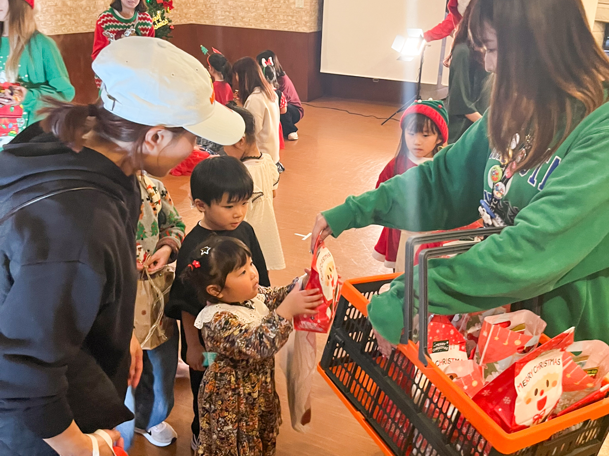 最後は2つのグループに分けてプレゼント交換を行いました。自分のプレゼントが戻ってくるハプニングもありましたが、お父さん、お母さんのサポートもあり、無事全員の手元にプレゼントが届きました。「お母さんのプレゼントが欲しかった」と落ち込んでる子もいましたが、プレゼントを手にした子ども達はとても嬉しそうでした。