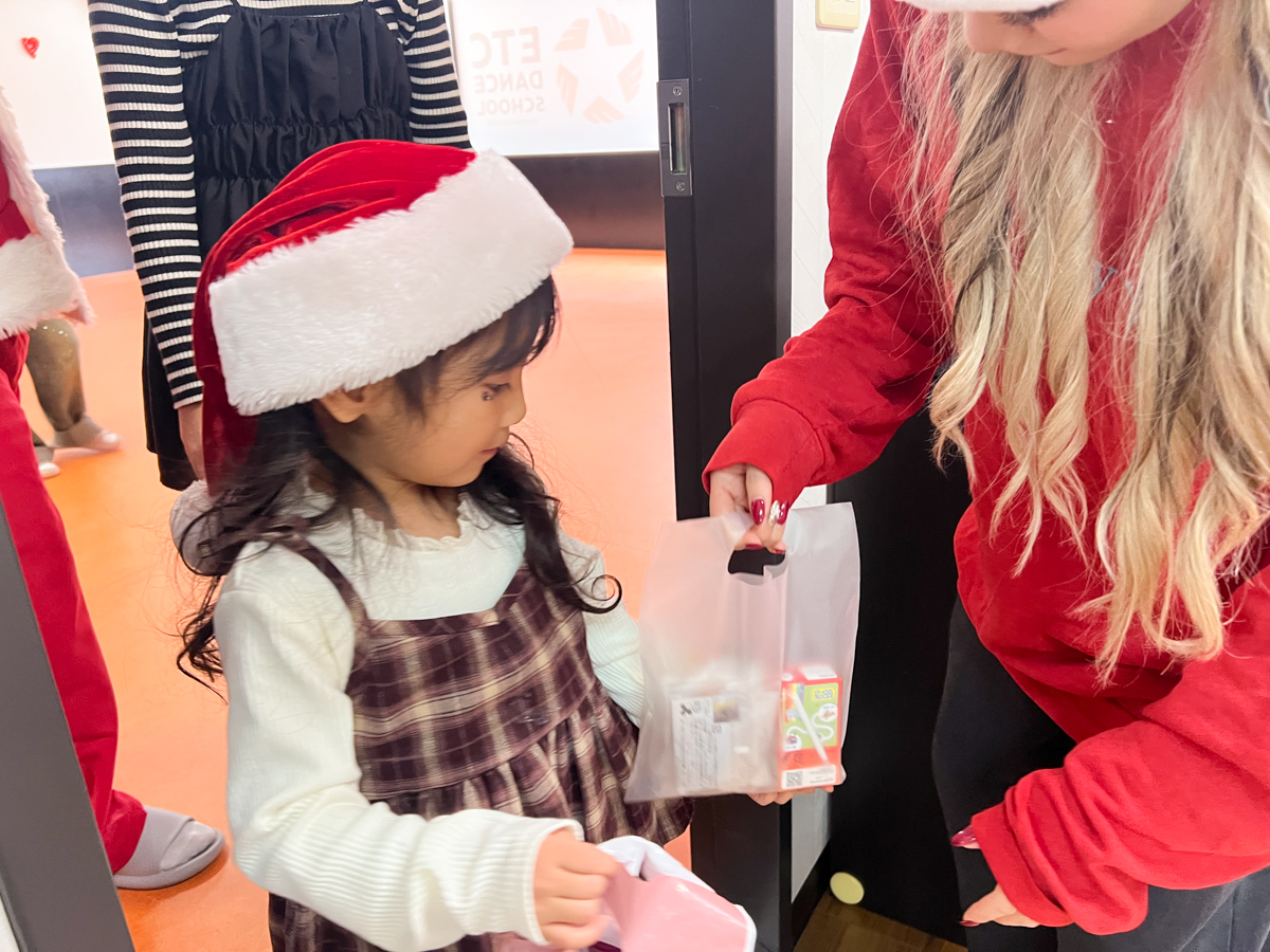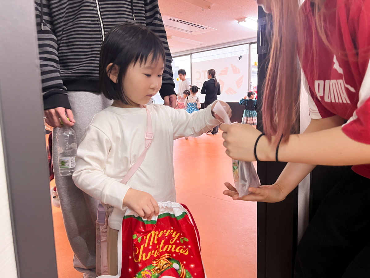 イベントのラストは、みんなが楽しみにしていたビンゴ大会!いつもレッスンを担当している先生たちがサンタさんとなり、ビンゴになった子には先生たちからプレゼントが贈られ、大盛り上がりでした。さらに特別ゲストのツリーさんも登場し、終始笑顔と笑いに包まれた楽しいイベントとなりました。