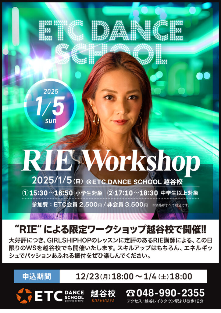 大好評につき、GIRLSHIPHOPのレッスンに定評のあるRIE講師によるこの日限りのWSがついに越谷校でも開催されます👏👏