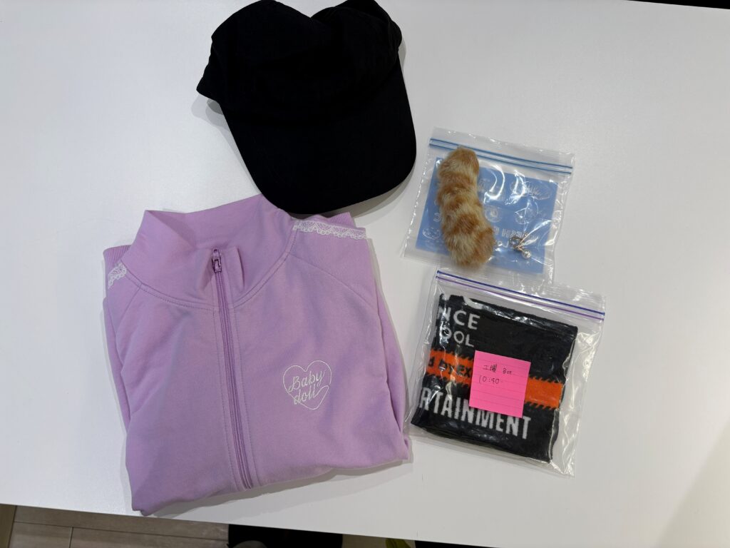 👇薄紫色のパーカー、黒い帽子、キーホルダー、パールがついたイヤリング、