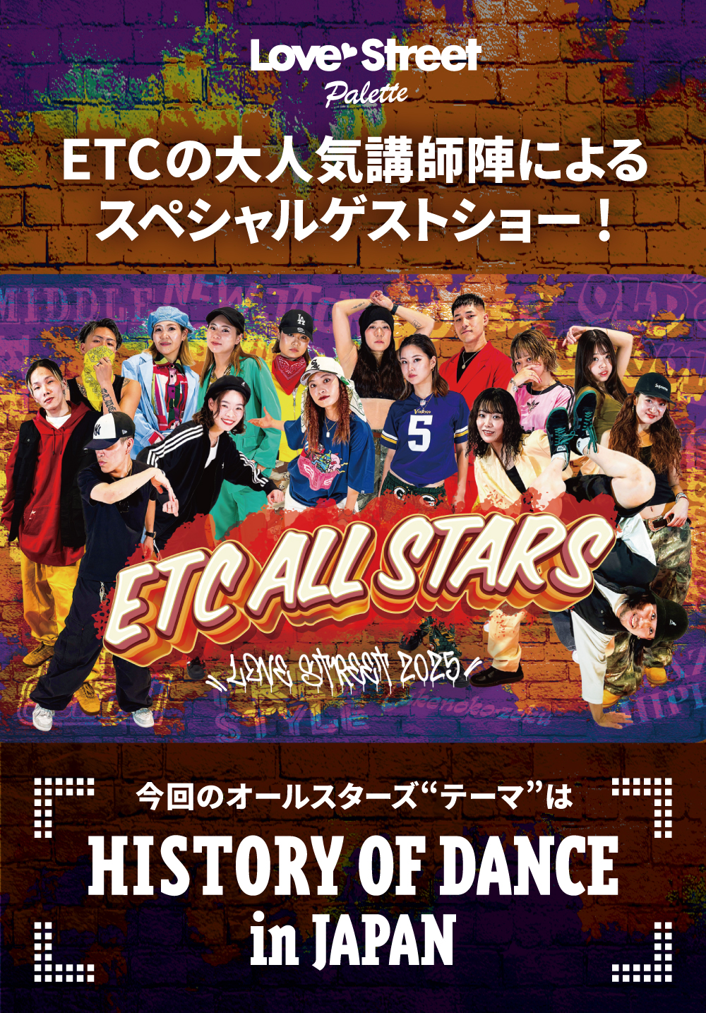 【GUEST】ETC ALL STARS 出演情報!! 2025.09.04 LOVE STREETオオトリを飾る、ETCの大人気講師16名によるこの日限りのスペシャルSHOW CASE! 今回のオールスターズテーマは「HISTORY OF DANCE in JAPAN」 日本のダンスの歴史をテーマにいろんなジャンルを年代ごとにたっぷりと魅せるSHOW CASE!! 音楽もダンスも共に楽しめる、この日限りのスペシャルSHOWCASEをお楽しみに! 出演者・有綺(プロデューサー) ・Yu-ho(プロデューサー) ・Ayako ・Katy ・天厳 ・Mizuki ・HIRONO ・dsk ・奏 ・suzu ・yuuri ・CoCoRo ・sh1on ・Kali ・Luna ・SAKi 本番出演時間19:35予定 「本番当日のお知らせ」を公開しました!必ずご確認ください! 【GOODS】ETC ALL STARSアイテム販売!