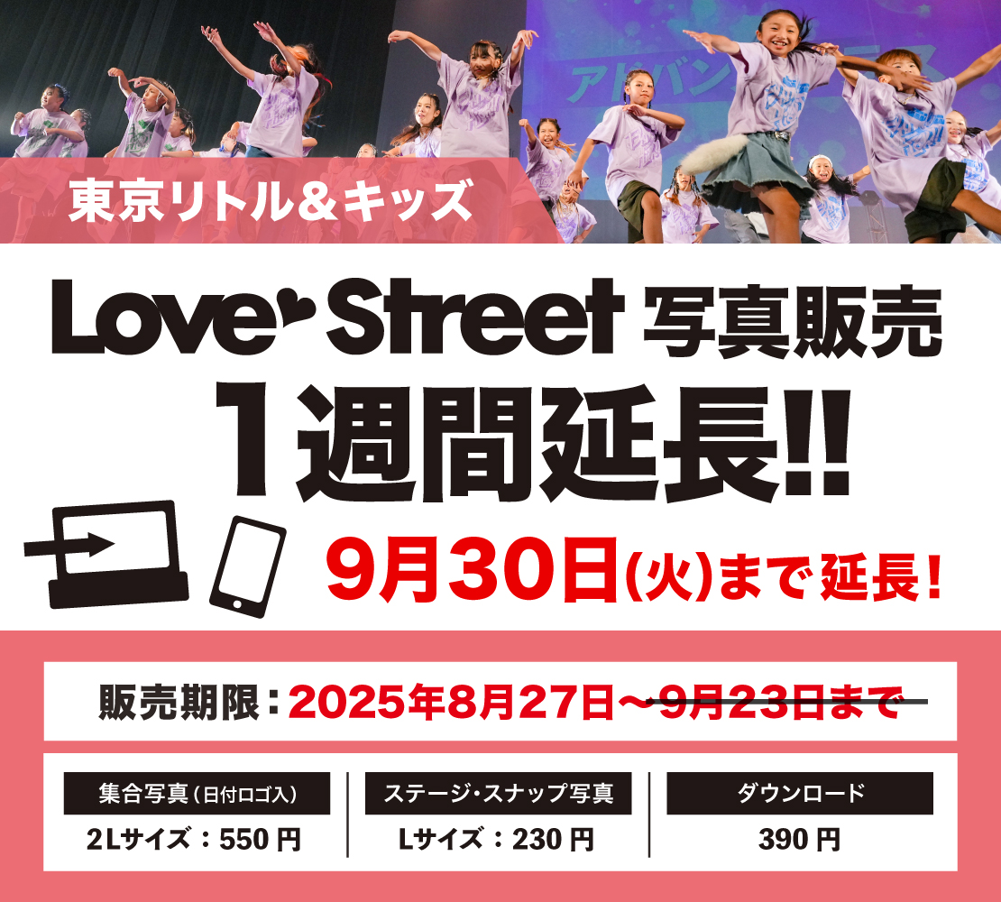 【写真販売】9/30(火)まで!! 1週間延長のお知らせ 2025.09.23 ※販売期間延長!2025年9月30日(火)まで!! 写真販売サイトはこちら ※閲覧には16ケタの認証キー入力が必要です。 ↓ ↓ ↓ 認証キー ↓ ↓ ↓6976-2469-3489-abqy ETC東京エリア リトル&キッズ発表会「LOVE STREET 2025 ~Palette~」の当日写真は、写真販売サイト『フォトレコ』にてご購入いただけます。閲覧だけなら認証キーを入力するだけ!会員登録も不要です。 販売期間2025年8月27日(水)~9月23日(火) 2025年8月27日(水)~9月30日(火) ※1週間延長いたしました! お支払い方法・コンビニ決済 ・クレジットカード決済 注意事項◆ご使用のスマホのOSバージョンや機種特有の問題により、一部の端末では正常に動作しない場合があります。予めご了承ください。 ◆認証キーはSNS等で拡散しないようお願いいたします。 ◆10月以降の再販はございません。期日までにお早めにご購入ください。 【オンライン販売】ETC ALL STARSTシャツ(サイン... 発表会の本番映像配信中!【12/27まで】
