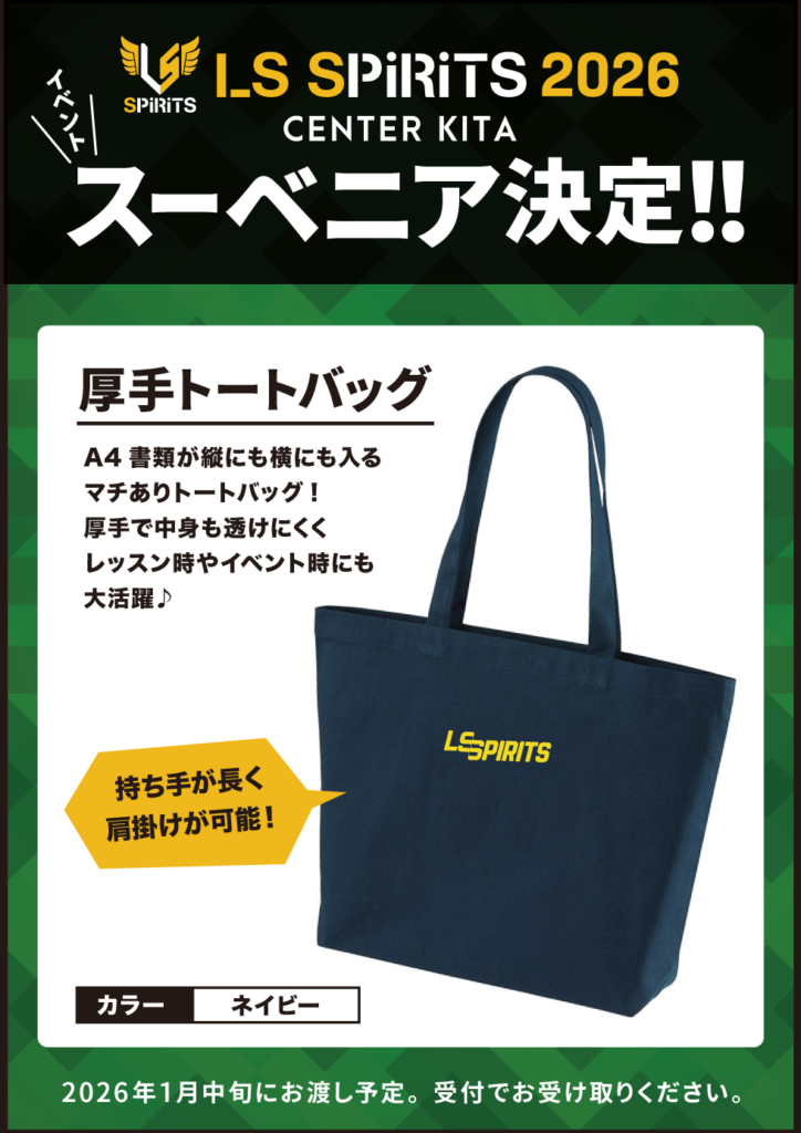 LS SPIRITS 2026 スーベニアが決定! 2025.12.10 2026.02.06 LS SPIRITS 2026のスーベニアが決定いたしました! ◆厚手トートバッグ A4書類が縦にも横にも入るマチありトートバッグ!厚手で中身も透けにくく、レッスン時やイベント時にも大活躍♪ LS SPIRITS CENTER KITA 2026 の公式サイトを公開いたしました! 前の記事 チケットの購入について 次の記事