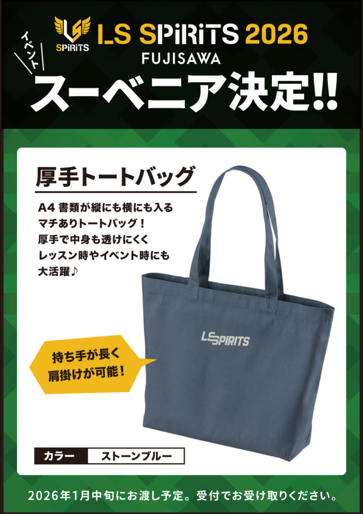 LS SPIRITS 2026 スーベニアが決定! 2025.12.11 2026.02.06 LS SPIRITS 2026のスーベニアが決定いたしました! ◆厚手トートバッグ A4書類が縦にも横にも入るマチありトートバッグ!厚手で中身も透けにくく、レッスン時やイベント時にも大活躍♪ LS SPIRITS FUJISAWA 2026 の公式サイトを公開いたしました! 前の記事 チケットの購入について 次の記事