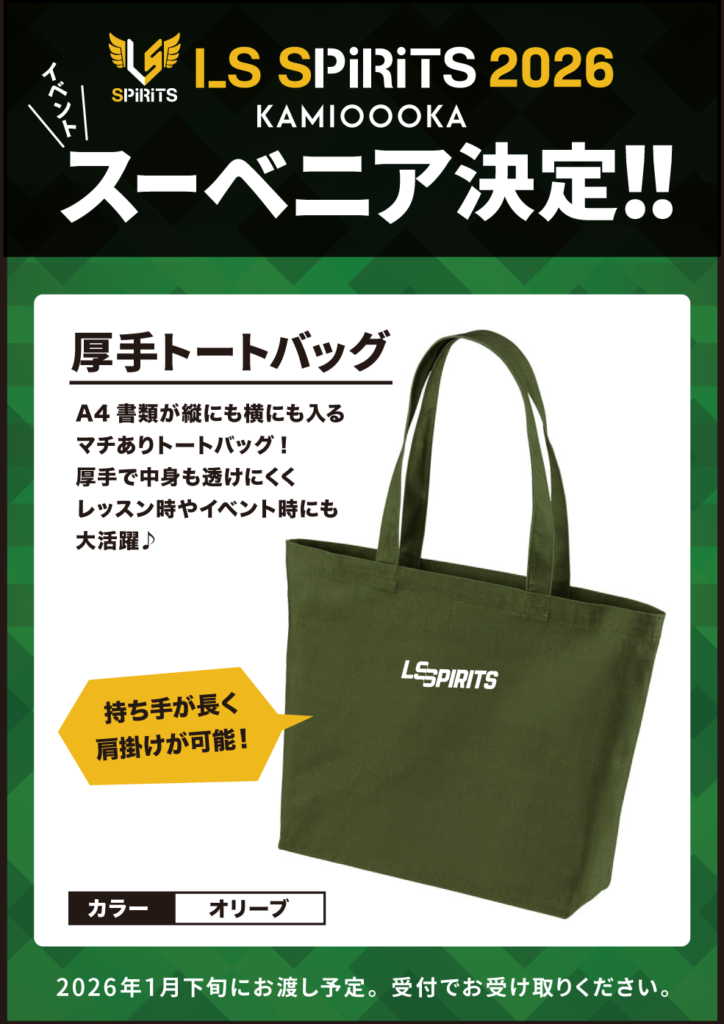 LS SPIRITS 2026 スーベニアが決定! 2025.12.26 2026.02.06 LS SPIRITS 2026のスーベニアが決定いたしました! ◆厚手トートバッグ A4書類が縦にも横にも入るマチありトートバッグ!厚手で中身も透けにくく、レッスン時やイベント時にも大活躍♪ LS SPIRITS KAMIOOOKA 2026 の公式サイトを公開いたしました! 前の記事 チケットの購入について 次の記事