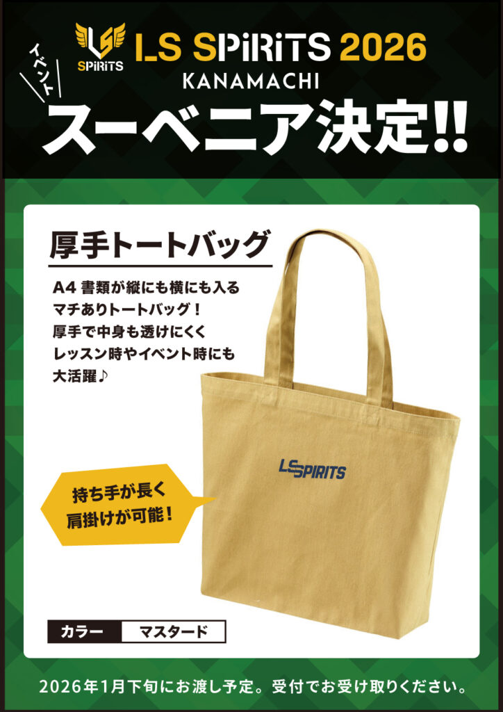 LS SPIRITS 2026 スーベニアが決定! 2025.12.26 2026.02.06 LS SPIRITS 2026のスーベニアが決定いたしました! ◆厚手トートバッグ A4書類が縦にも横にも入るマチありトートバッグ!厚手で中身も透けにくく、レッスン時やイベント時にも大活躍♪ LS SPIRITS KANAMACHI 2026 の公式サイトを公開いたしました! 前の記事 チケットの購入について 次の記事