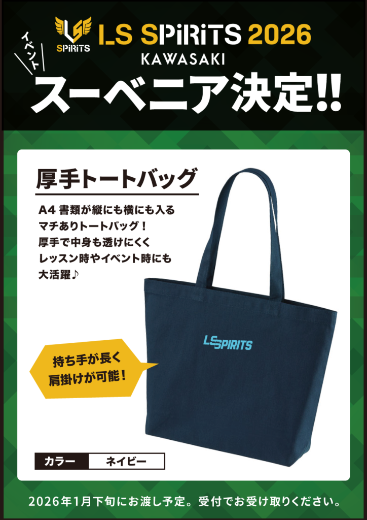 LS SPIRITS 2026 スーベニアが決定! 2025.12.26 2026.02.06 LS SPIRITS 2026のスーベニアが決定いたしました! ◆厚手トートバッグ A4書類が縦にも横にも入るマチありトートバッグ!厚手で中身も透けにくく、レッスン時やイベント時にも大活躍♪ LS SPIRITS KAWASAKI 2026 の公式サイトを公開いたしました! 前の記事 チケットの購入について 次の記事
