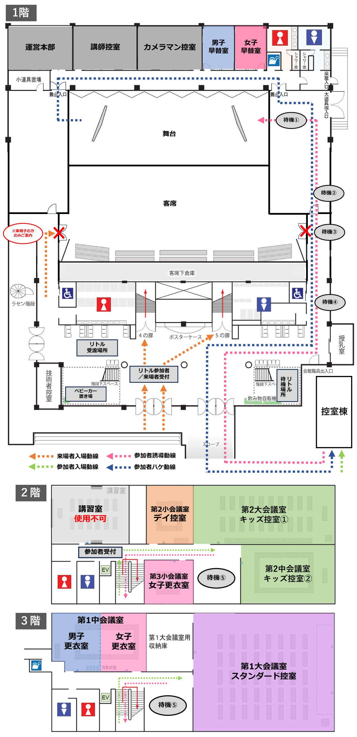 | リトル演目終了後、スタッフがリトル受渡場所(会場図面 1階 参照)へ誘導し、解散となります。 保護者はお迎えをお願いいたします。リトル受渡場所は会場図面をご確認ください。 |