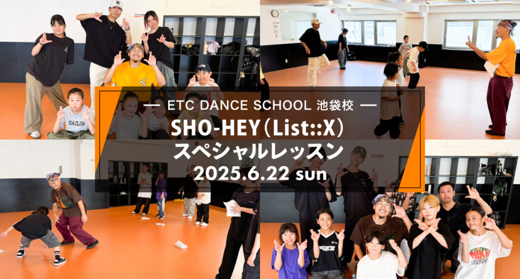 2025年6月22日(日)に、池袋校にてDリーグで大人気チーム「List::X」に所属するSHO-HEYさんによるスペシャルレッスンが開催されました!SHO-HEYさんからはDANCEの基礎となる重心、体重移動の使い方、1つのステップの中にリズムを変化させていくリズムトレーニング、そして、SHO-HEYさん自身が実際に行っている練習方法を教えていただきました!普段ではなかなか体験出来ないレッスン内容となっており、とても勉強になりました!!